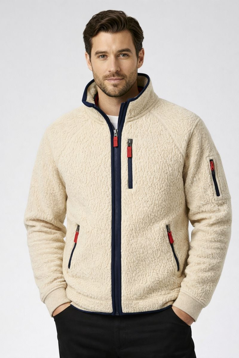 A soft, high-pile fleece jacket designed for warmth, comfort, and everyday wear. Made with a textured sherpa exterior, smooth inner lining, and a stand collar to help block the wind. Finished with contrast zipper detailing for a clean, modern look.
